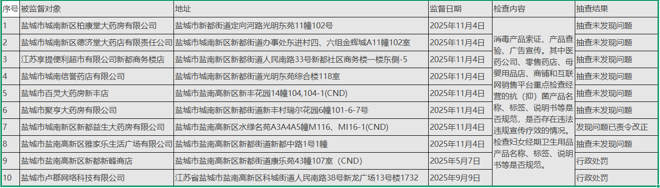 根据《关于印发2025年江苏省卫生健康随机监督抽查实施方案的通知》(苏疾控综函〔2025〕2号)和《关于做好 2025 年全市卫生健康随机监督抽查工作的通知》(盐卫通〔2025〕5 号)要求,盐城市疾病预防控制中心盐南疾控分中心(卫生监督分所)已完成2025年盐南高新区消毒产品经营单位省级随机监督抽查任务。