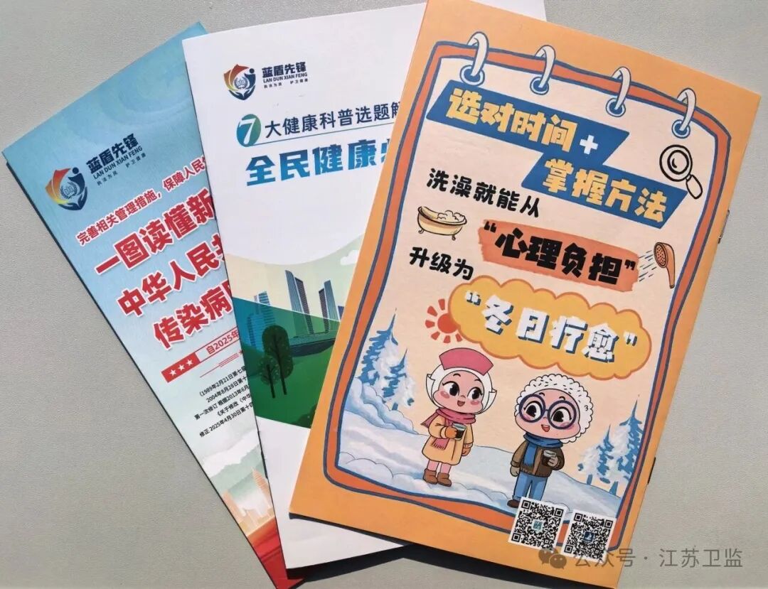 广场普法宣传中,工作人员在社区设置宣传点位,向过往群众发放新修订《中华人民共和国传染病防治法》、冬季洗澡攻略、全民健康科普等各类宣传折页、手册,现场宣讲卫生知识,耐心解答群众关于传染病预防、沐浴安全等方面的疑问。